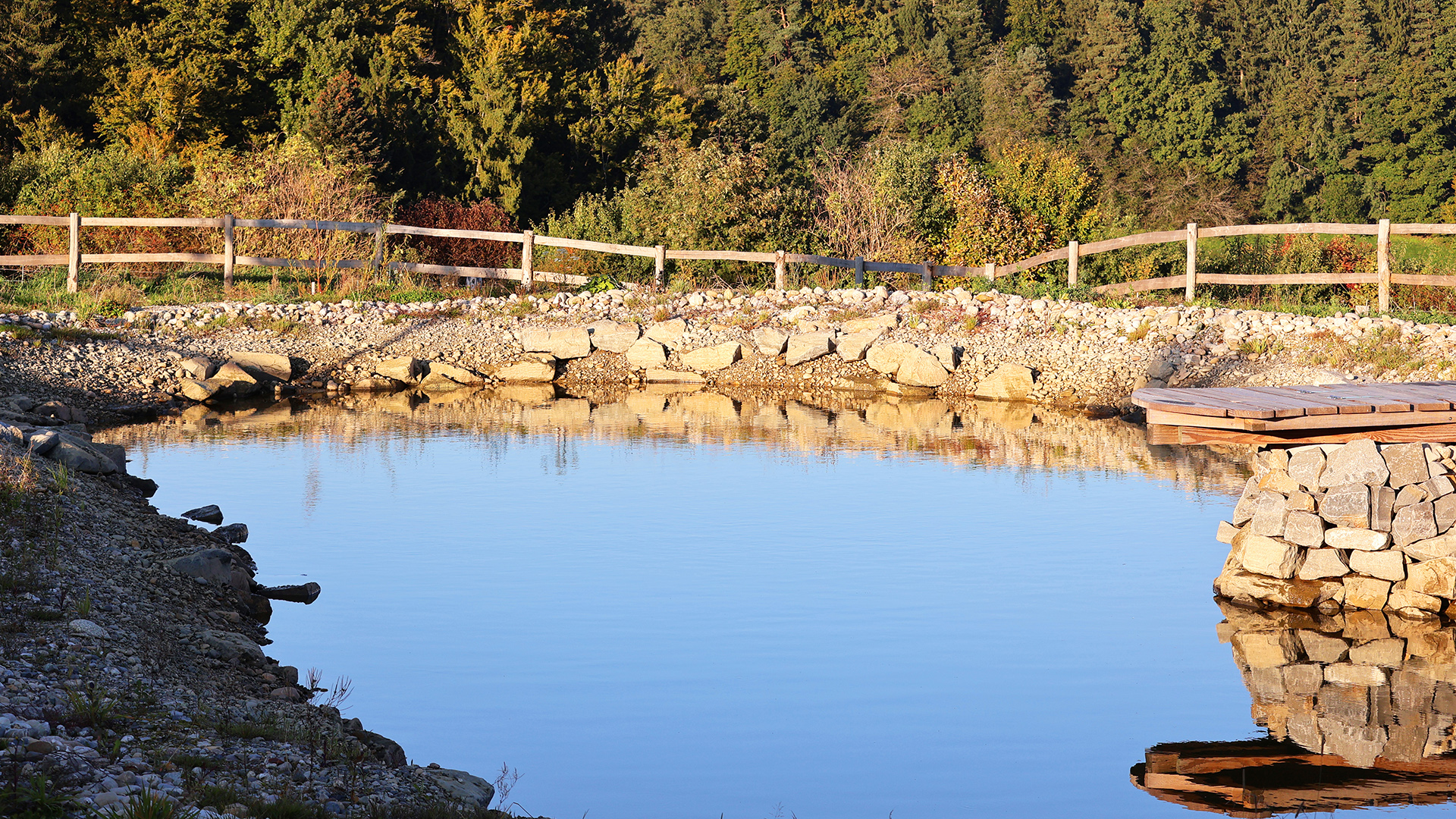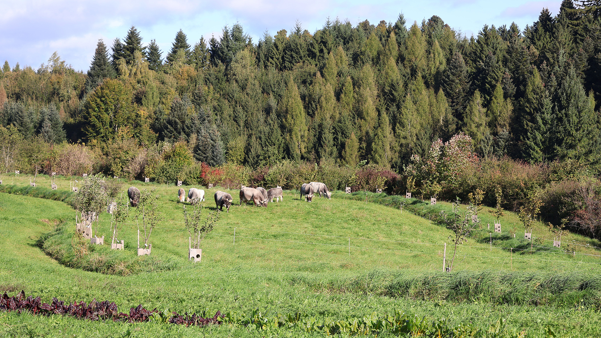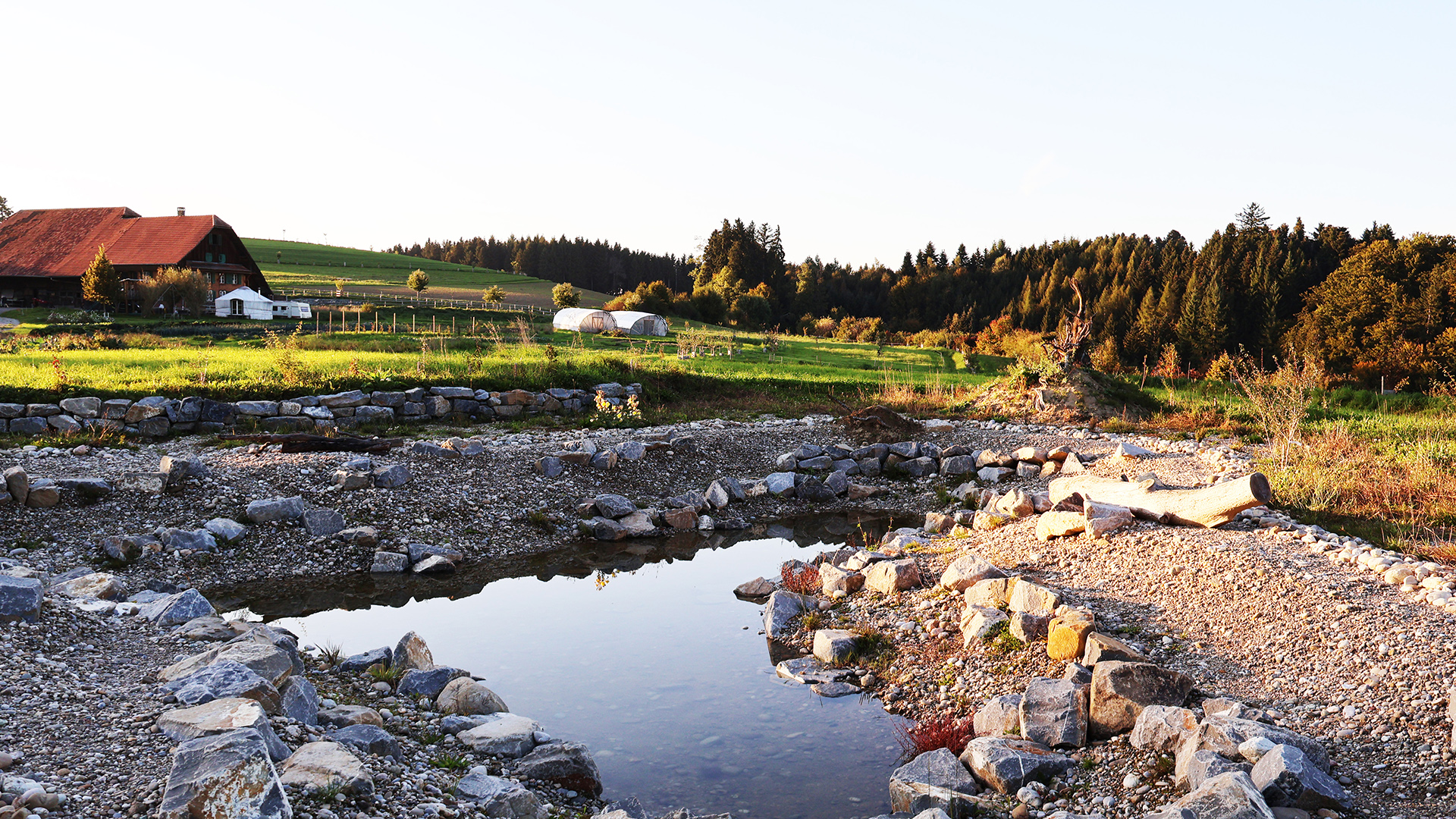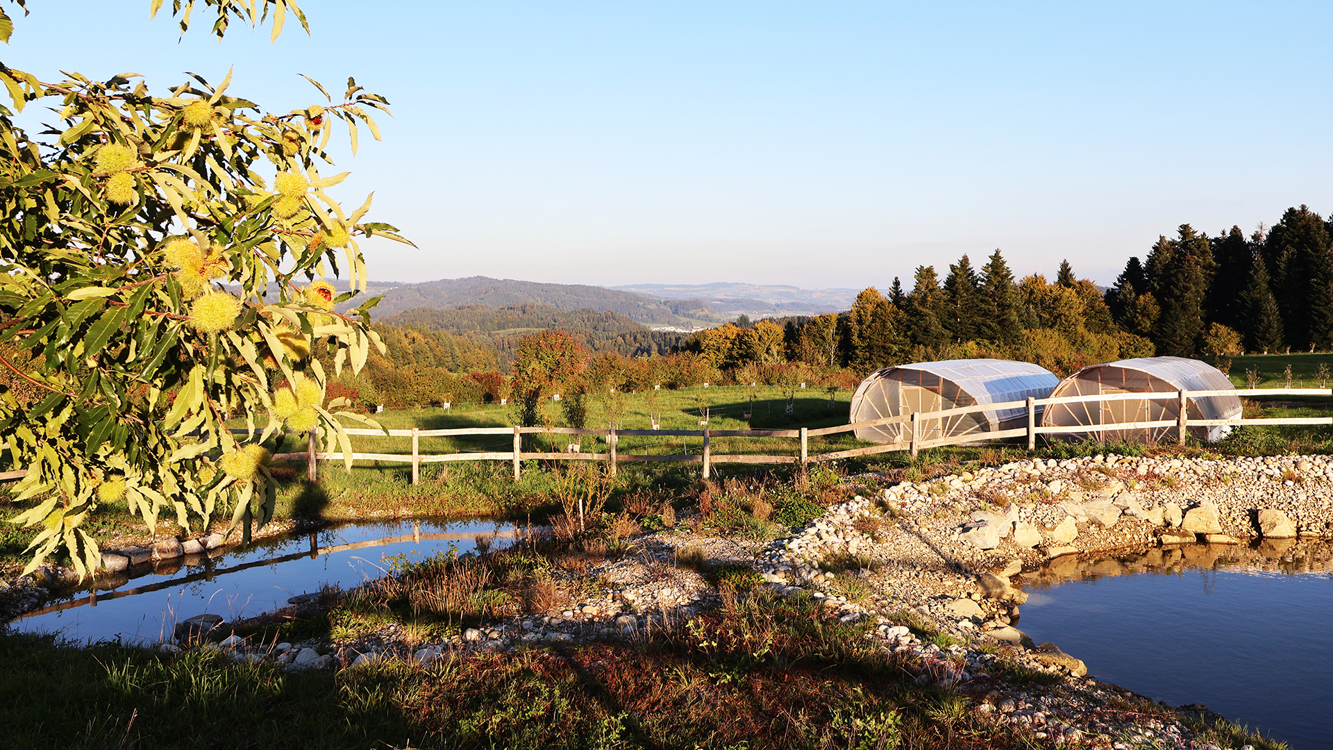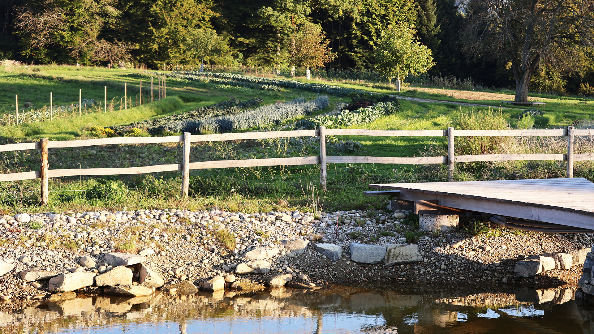 Darauf aufbauend entstand ein durchgängiges System vom Hang bis ins Tal: Oberflächenabfluss wird oberhalb der Hofflächen unterbrochen, Erosion vermieden und die höher gelegenen Schläge besser mit Sickerwasser versorgt. Überschüssiges Wasser wird kontrolliert in einen zentralen Speicherteich geleitet, der Hangwasser, Hof- und Dachwasser bündelt. Von dort aus erfolgt die geregelte Bewässerung der tiefer liegenden Kulturen, Bäume und Weideflächen.