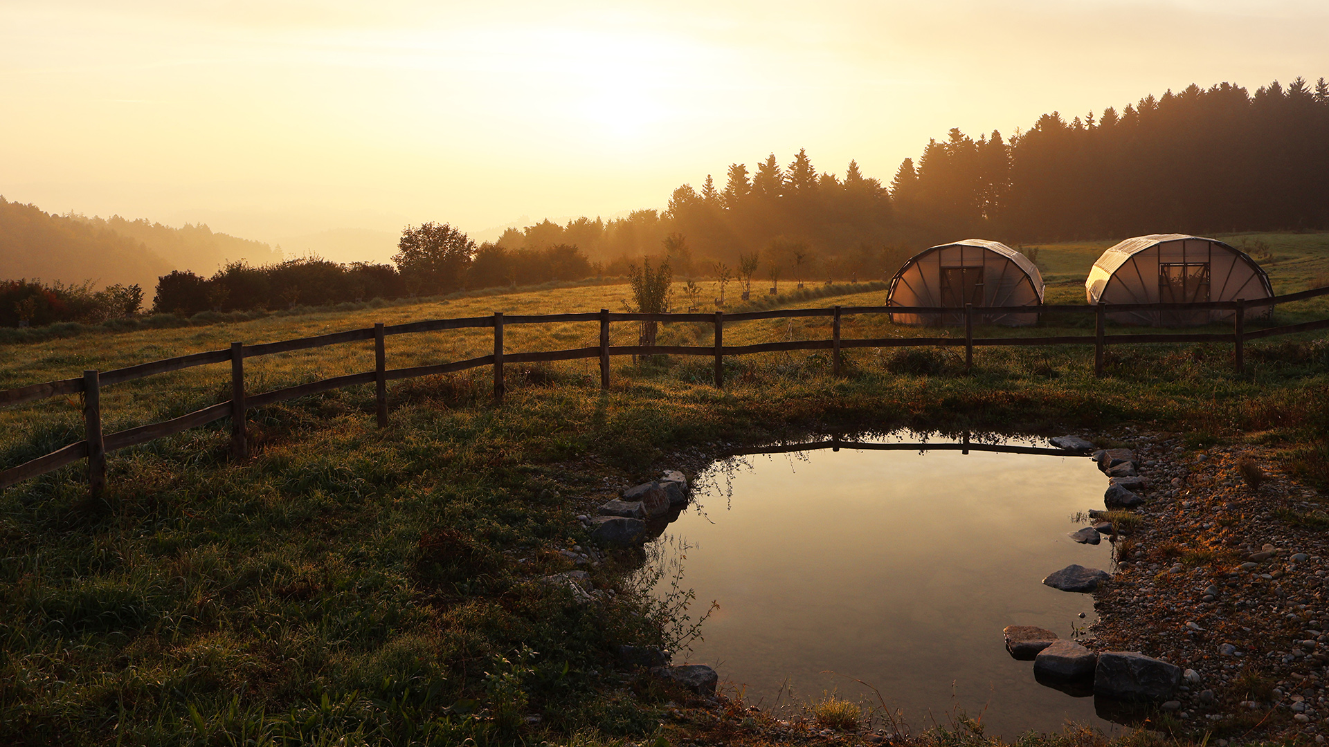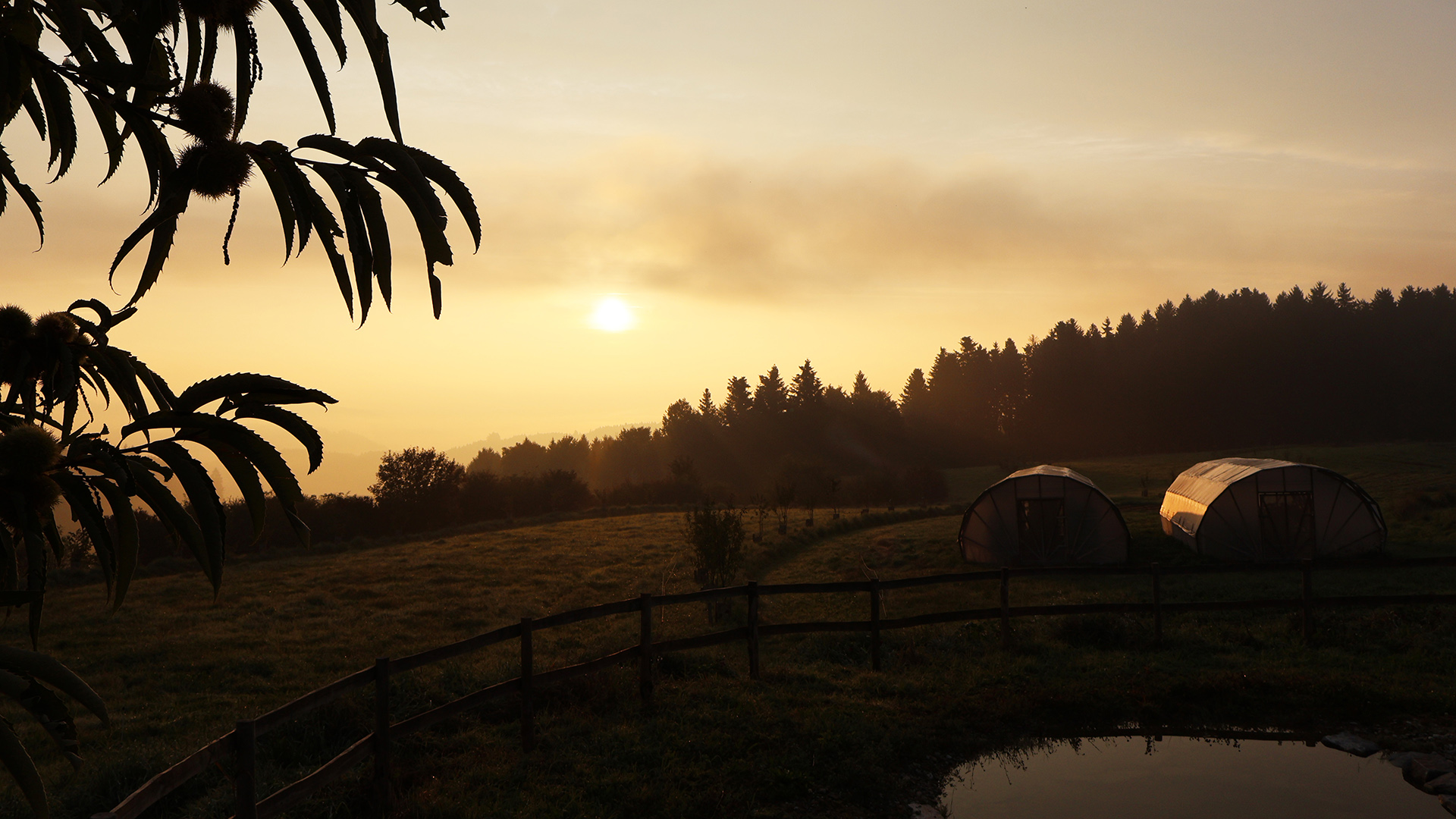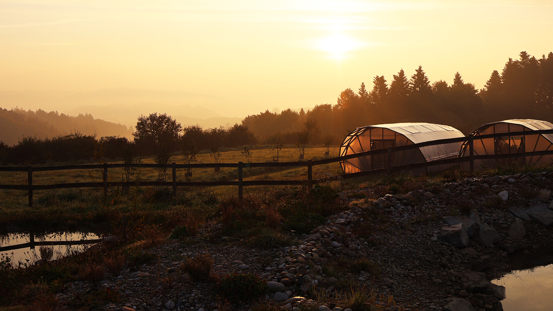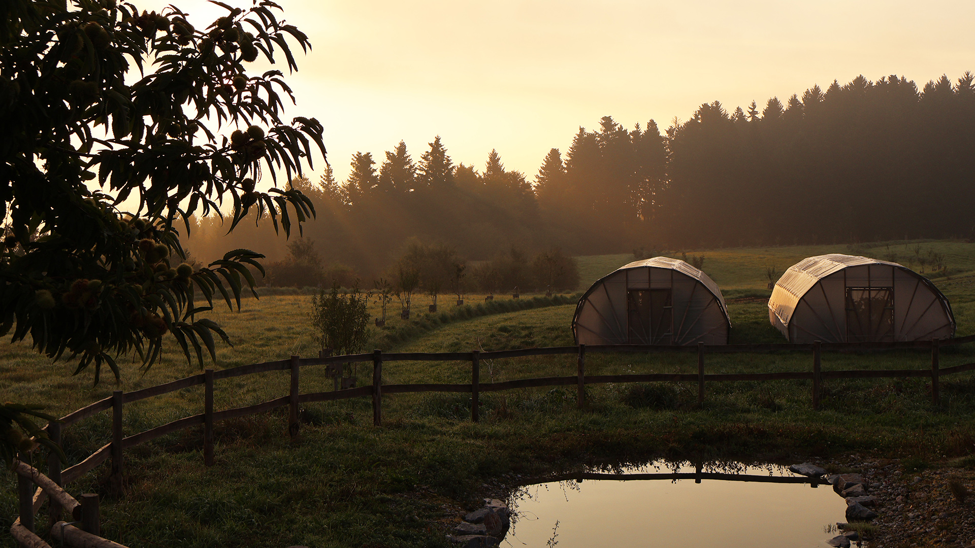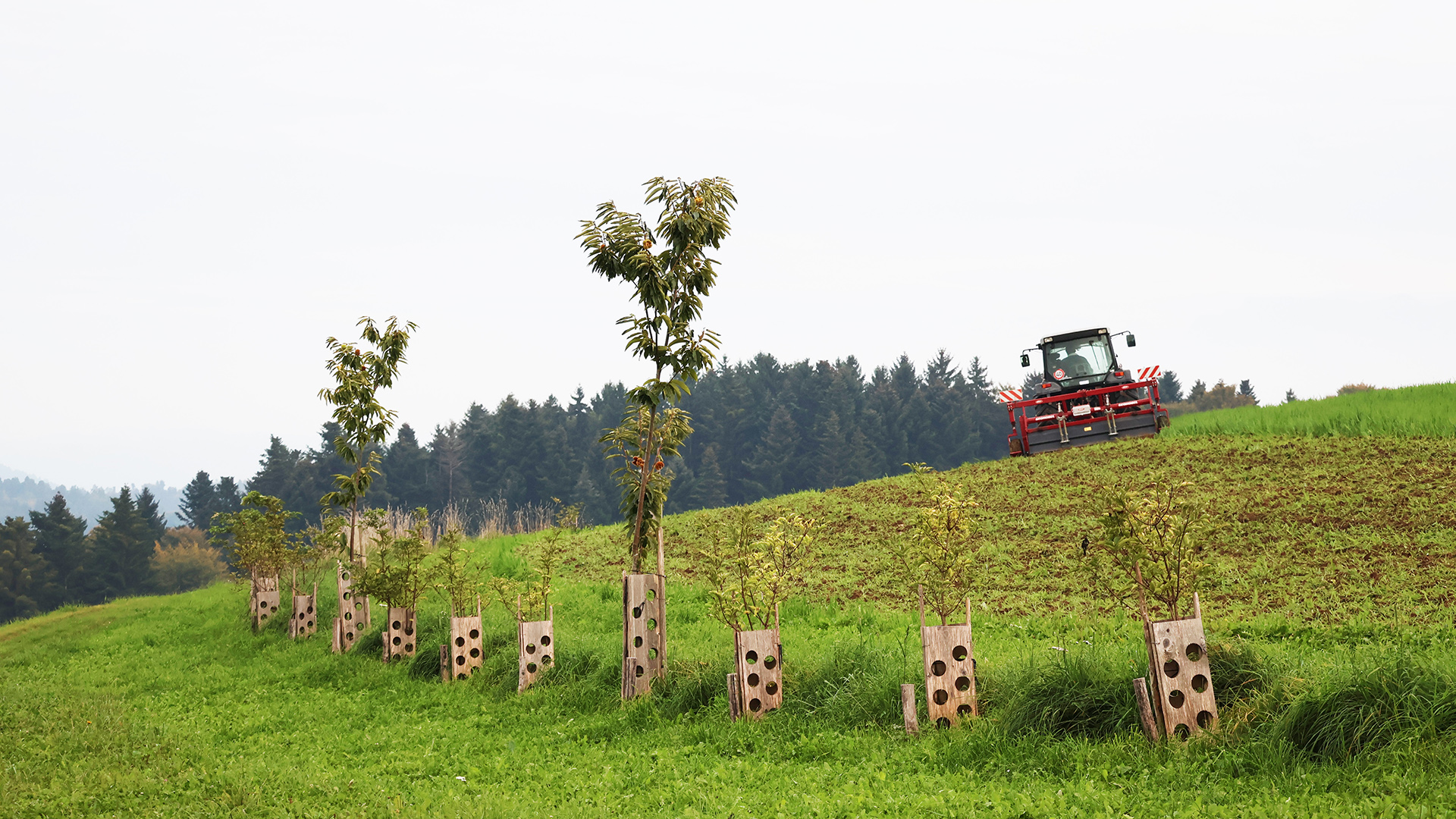 Darauf aufbauend entstand ein durchgängiges System vom Hang bis ins Tal: Oberflächenabfluss wird oberhalb der Hofflächen unterbrochen, Erosion vermieden und die höher gelegenen Schläge besser mit Sickerwasser versorgt. Überschüssiges Wasser wird kontrolliert in einen zentralen Speicherteich geleitet, der Hangwasser, Hof- und Dachwasser bündelt. Von dort aus erfolgt die geregelte Bewässerung der tiefer liegenden Kulturen, Bäume und Weideflächen.