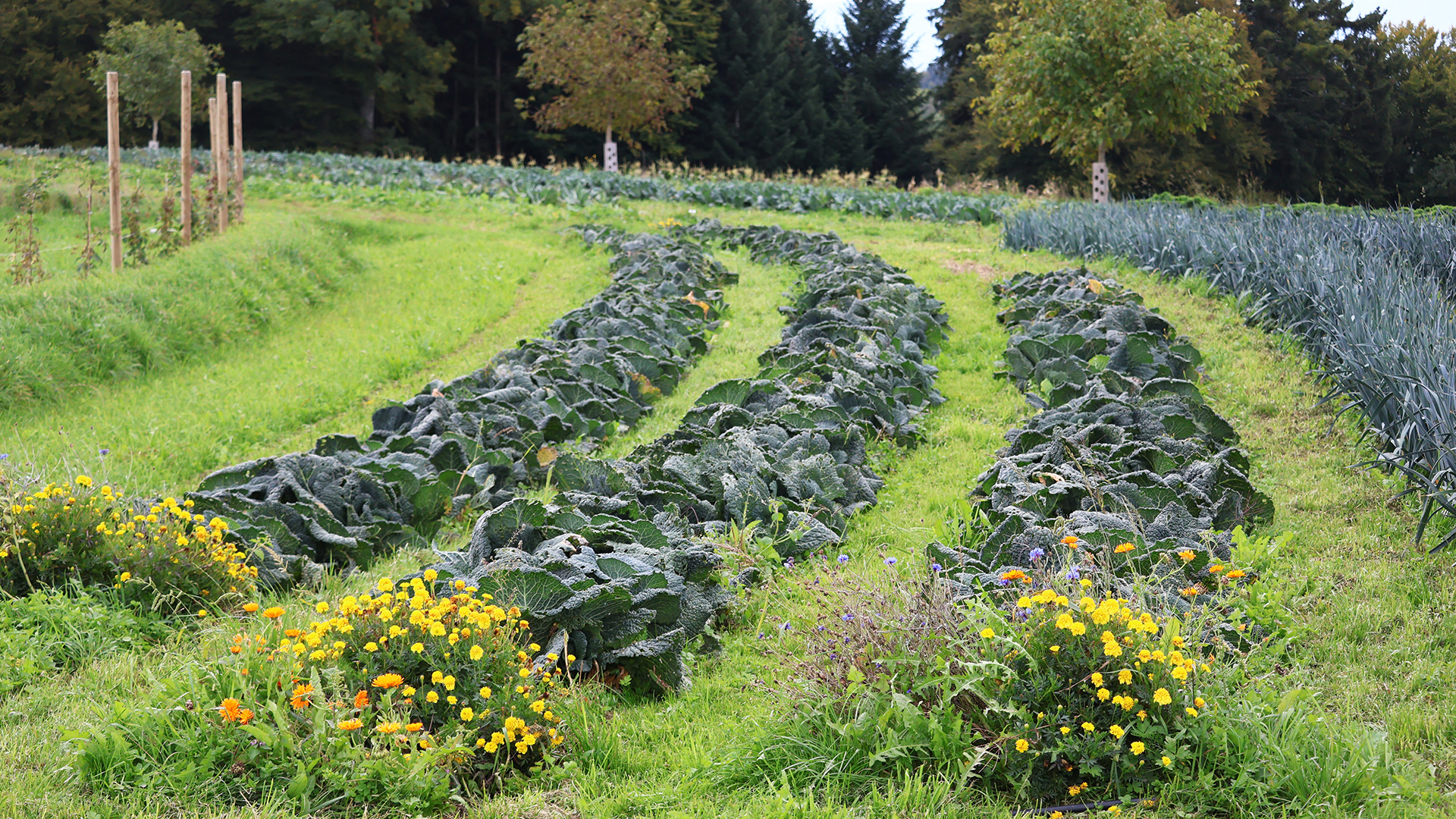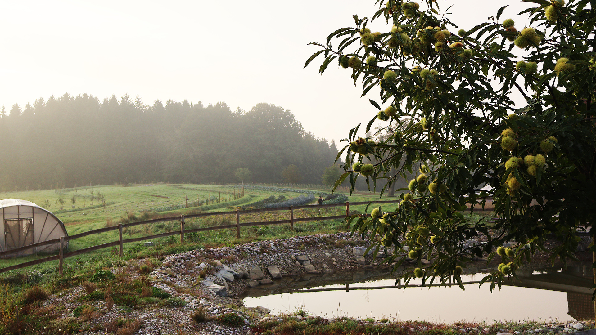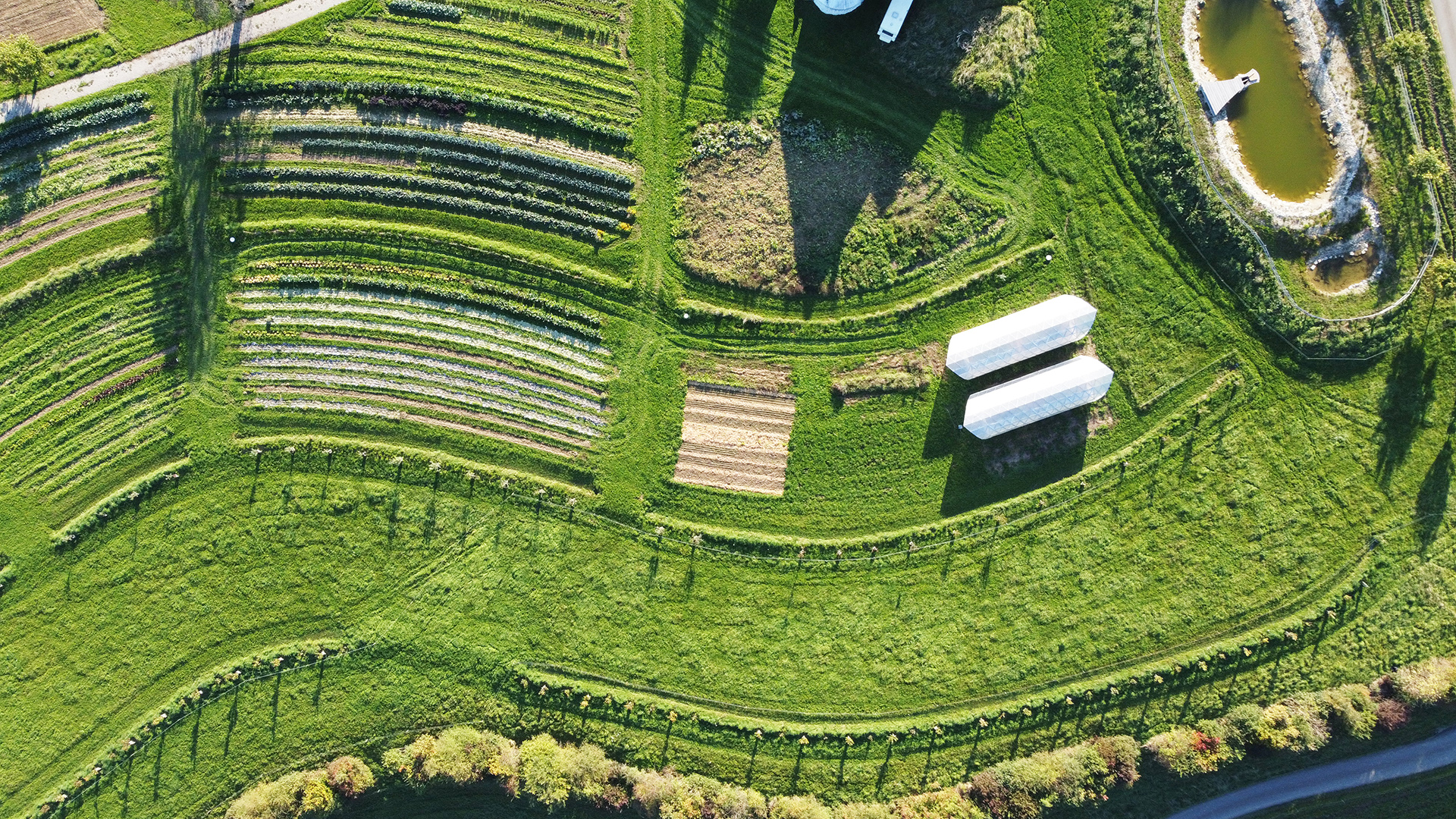 Auf allen landwirtschaftlich genutzten Flächen rund um die Hofstelle wurde ein zusammenhängendes Wassermanagementsystem umgesetzt, das Wasser zurückhält, lenkt, speichert und gezielt nutzbar macht – ausschließlich über Grabensysteme, ohne Pumpen. Diese gibt es zwar für einen effizienten Gemüsebau auch, aber die integrierten Teiche und Rohrsysteme ermöglichen allein über die Schwerkraft eine Verteilung des Wassers in die Fläche hinein.
